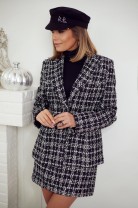 Elegancki komplet marynarki ze spódnicą podkreślający talię. Wykonane z tkaniny premium pochodzącej z najpopularniejszego francuskiego domu mody - Balmain. Oryginalna propozycja w czarnym kolorze przeplatana białą kratą. Ten luksusowy model nie tylko pięknie się prezentuję, a stworzony jest z prawdziwej wełny i domieszki jedwabiu. Idealny na każdą okazję.