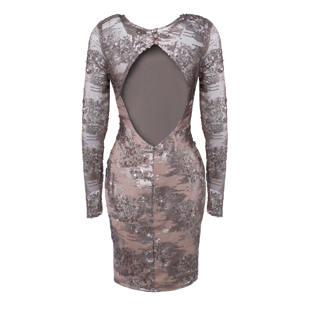 Sukienka uszyta jest z ażurowej tkaniny, pokrytej cekinami – poza rękawami, całość podszyta jest podszewką. Ozdobą są pięknie wycięte plecy, a krój pięknie podkreśla sylwetkę.